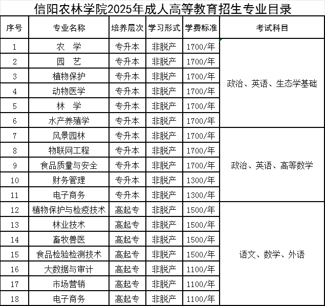 表1:2025年高等学历继续教育各专业收费标准