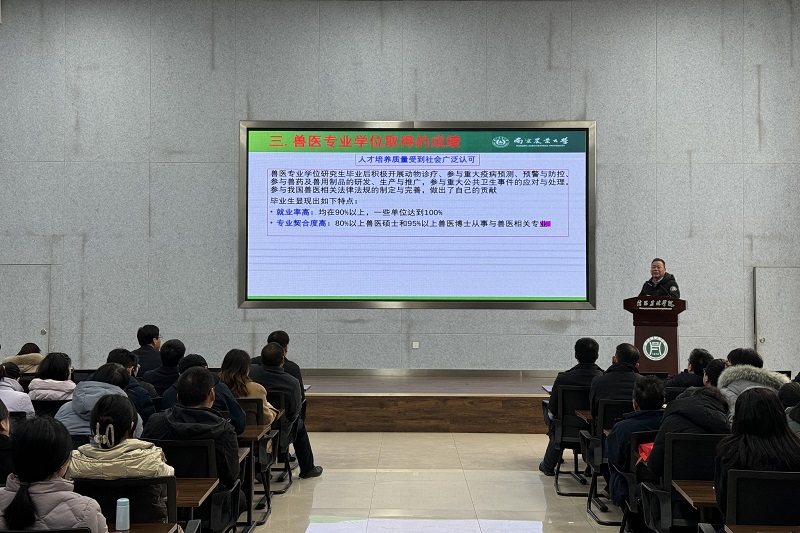 2月25日下午,南京农业大学李祥瑞教授在beat365在线平台官网众创空间多功能报告厅作了题为“兽医专业学位解析——兽医硕士”的学术报告。硕士点建设相关学院、动物科技学院全体教师、学生代表共计130余人参会。报告会由发展规划处处长熊元靖主持。