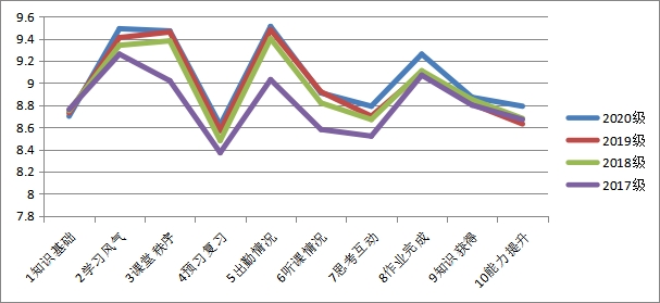 各项指标得分情况随着年级的增长呈现逐项降低趋势,尤其是2017级即毕业班学生的现象更为突出,需要特别关注的是,毕业班学生第3项课堂秩序、第5项出勤情况、第6项听课情况、第7项思考互动得分较其他年级明显较低,反映毕业班学生课堂出勤、课堂学习情况一般,出现这种情况的原因有,部分学生积极准备考研,对平时上课重视度不够;部分学生出现毕业前焦虑,单向认为找工作比上课更重要,即使人到课堂,但参与课堂互动的积极性和主动性也较低。而2020级新生进入大学后,对于大学新生活有很强的好奇心、憧憬感,同时还保留高中时候的学习紧张感,所以在各项表现尤其是课堂表现上比其他年级都要好。