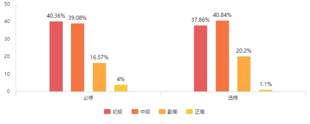 不难发现,承担必修课的副高级职称教师比例小于选修课同职级教师比例,而承担必修课的初级职称教师比例却大于选修课同职级教师比例,这点应该引起一定重视。