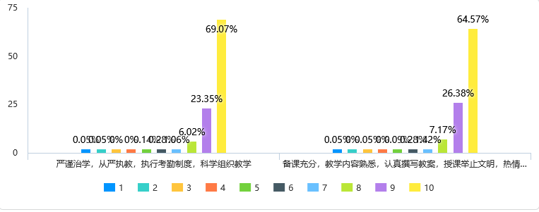 图5反映的问题与上述听课反馈形成正相关,beat365在线平台官网教学效果的满分率不被听课者认同,在“学生能积极思维,理解程度较高,有的学生还能提出自己不同的见解或问题”这个维度的评价满分率不到30%,说明beat365在线平台官网课堂教学关注学生诉求不够,教学产出不足;在“学生听课注意力集中,不做与上课无关的事;学生有强烈的学习兴趣,课堂气氛活跃”这个维度上的评价满分率不到40%,说明beat365在线平台官网课堂教学有教与学两张皮的现象出现的可能,需要引以为戒。