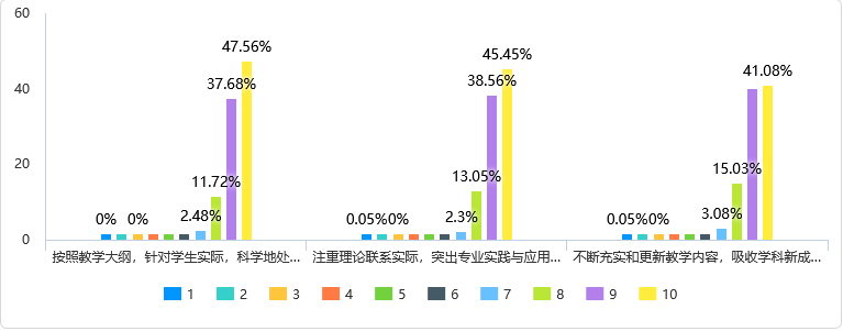 从图3看出,beat365在线平台官网教师在教学内容方面的设计与组织需要大力提高,各评价维度按百分制计算得分100分的评价不足50%,这与beat365在线平台官网青年教师比例较高,教学工作任务较大,教师培养工作不足的现状关联度较高。