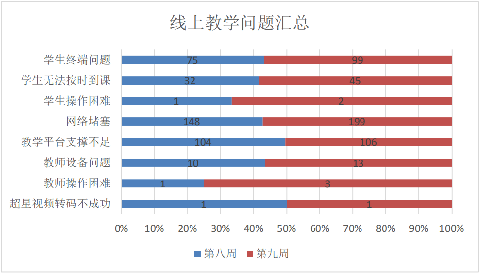 第八周开课共计1337门次,教师满意率为90.6%。第九周开课共计1939门次,教师满意率为87%,相较第九周降低3.6%。统计结果显示,线上教学问题依然存在,第八周出现问题的课程占比为28%,第九周为24.4%,整体降低了3.6%。仍然存在个别教师和学生操作困难现象。