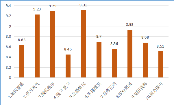本学期学生的整体学习情况比较好,各项指标得分均在8分以上。其中,第2项(学习风气)、第3项(课堂秩序)、第5项(出勤情况)的得分分别较高,显示学生课堂出勤情况较好,多数学生尊敬师长、举止文明,课堂秩序好。第4项(预习复习)得分率相对较低,反映出学生课前预习及课后复习的习惯相对较弱。