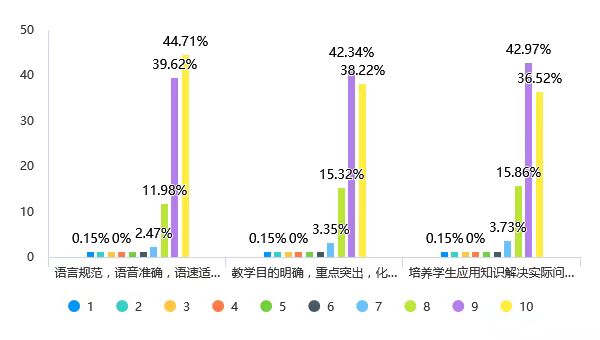 该维度平均分为9.15分(满分10分计),“语言规范,语音准确,语速适当,条例清楚,表达生动;板书清晰、恰当,布局合理”的满分率为44.71%;“教学目的明确,重点突出,化解难点,详略得当,脉络清晰;注重启发式教学,注重创新精神培育,注重创新思维训练”的满分率为38.22%;“培养学生应用知识解决实际问题的能力,教给学生学习和获得信息的方法”的满分率为36.52%。