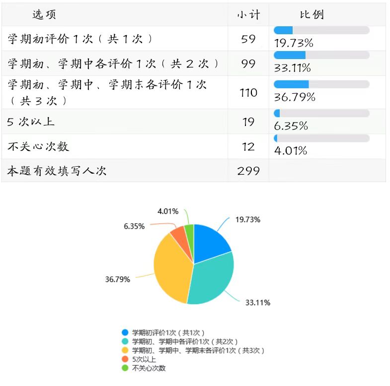 从反馈情况来看,在学生教学信息员的最低工作量确定上,“学期初、学期中、学期末各评价1次(共3次)”是同学们认可度最高的取值范围(占比36.79%)。(详见下图表)