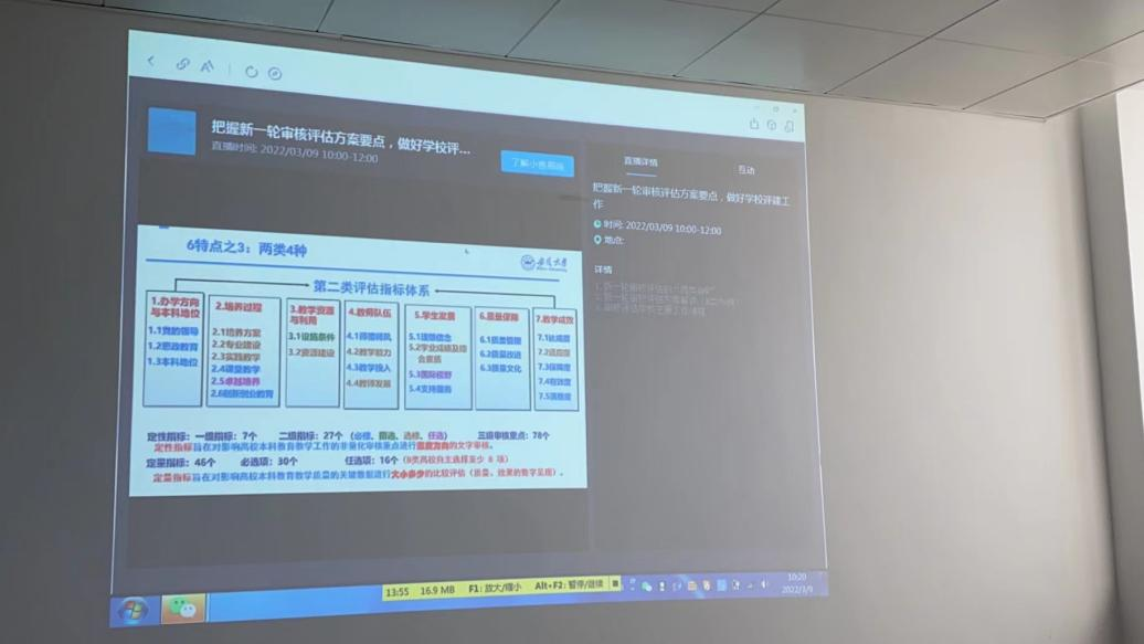 2022年3月9日,监评中心全体人员在线参加了“把握新一轮审核评估方案要点,做好学校评建工作”主题讲座的工作培训,主讲人傅勇教授介绍了新一轮审核评估的“两类四种”,对新一轮审核评估方案进行了解读,介绍了审核评估学校主要工作流程。根据专家提出的“采信专业认证结果”“课程系数”“高等学校法治工作测评指标”等技术问题,监评中心会后进行了积极地研讨。
