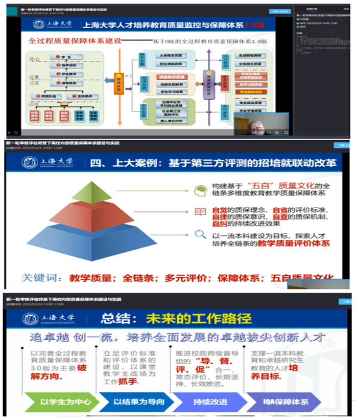 此次线上主题会议的召开,为与会人员提高关于新一轮审核评估的认识,理清参加新一轮审核评估的基本思路,利用信息技术平台,提高教育评价的科学性、专业性、客观性发挥了积极作用,为学校的教学质量保障体系建设提供了有益参考。