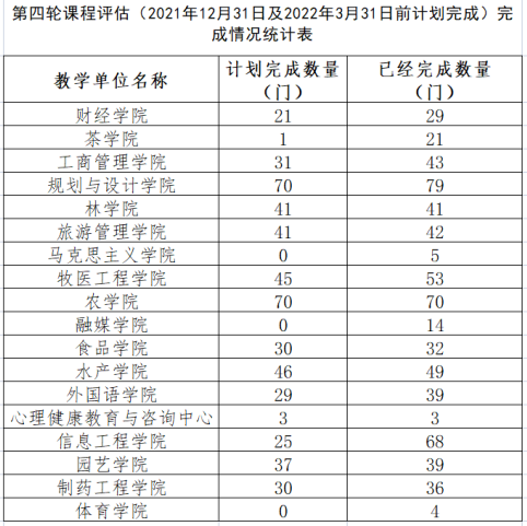 根据各教学单位提交的第四轮课程评估计划表,现将各教学单位计划2021年3月31日前完成和已完成的课程评估填报情况予以公示。