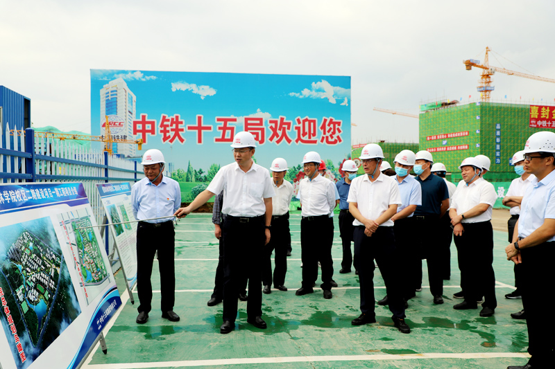 蔡松涛首先来到学校二期项目建设工地,主持现场观摩会,听取了中铁十五局关于工程施工进度的汇报,现场查看了实验楼、教学楼、学生餐厅、宿舍楼和体育场等楼体建筑的施工情况。蔡松涛要求,要树牢精品工程意识,按照标准化和绿色建筑建设理念,加快工程进度,精心组织施工,注重细节品位,彰显学校特色,在保证质量安全和环保达标的前提下,加快建设进度,确保早日投用。