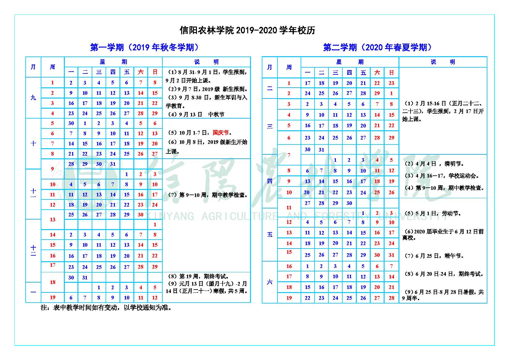 2019-2020学年校历