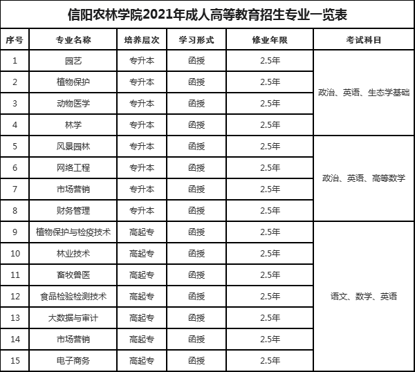 (一)专科起点升本科:农学(政治、英语、生态学基础)专业:园艺、植物保护、动物医学、林学;理工(政治、英语、高数等数学)专业:网络工程、风景园林、财务管理、市场营销、食品科学与工程、