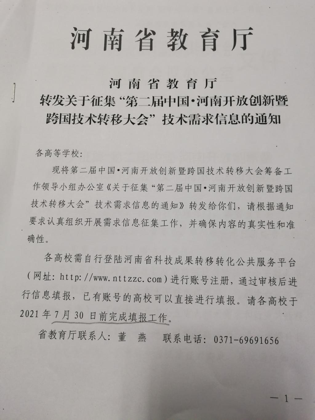 关于征集“第二届中国·河南开放创新暨 跨国技术转移大会”技术需求信息的通知