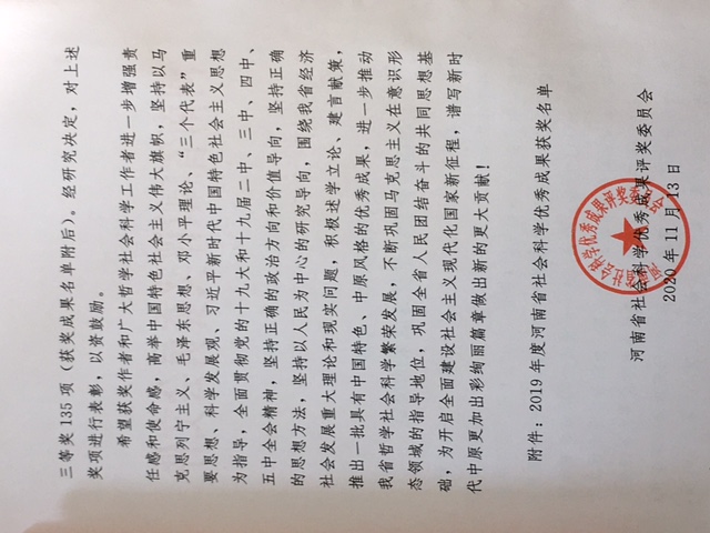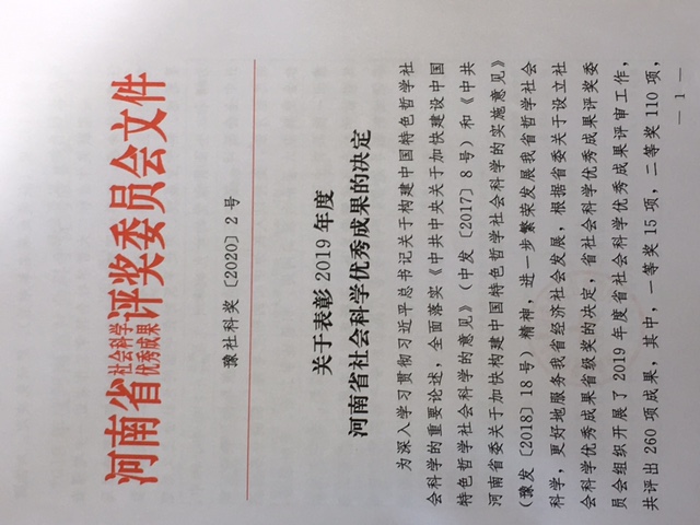 根据河南省社会科学优秀成果评奖委员会文件(豫社科奖【2020】2号)《关于表彰2019年度河南省社会科学优秀成果的决定》通知:“省社会科学优秀成果评奖委员会组织开展了2019年度河南省社会科学优秀成果评审工作,共评出260项成果;其中:一等奖15项,二等奖110项,三等奖135项。经研究决定,对上述奖项进行表彰,以资鼓励”。beat365在线平台官网旅游管理学院沈克副教授的专著成果荣获2019年度河南省社会科学优秀成果二等奖。