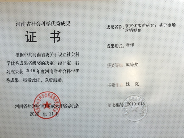 2019年度河南省社会科学优秀成果奖申报工作开始后,beat365在线平台官网总共提交4项参与评奖的成果材料,其中旅游管理学院沈克副教授申报的专著成果《茶文化旅游研究:基于市场营销视角》,经评委会专家评审、省评奖委员会研究决定:荣获2019年度河南省社会科学优秀成果二等奖!这份获奖成果荣誉既是沈克副教授的个人荣誉,也是beat365在线平台官网人文社科研究成果以主持人身份获得的又一项省级二等奖项;为学校争了光、添了彩!值得表扬!可喜可贺。(科技处喻明达)