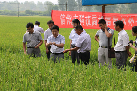 现场考察的第二站是罗山县周党镇农业部万亩水稻高产创建项目示范基地。罗山县莲花农机农艺专业合作社负责人包乃勇介绍了合作社水稻种植的基本情况,该基地种植水稻品种以深两优5814、Y两优1928、Y两优973、冈优689为主,通过实施精确定量栽培、配方施肥、机械化插秧、水分湿润管理、病虫草害综合防治等关键技术,产量目标达到700公斤/亩。农学、植保方面的专家现场解答了水稻种植过程中出现的疑难问题,指出了水稻扬花、灌浆期的注意事项。