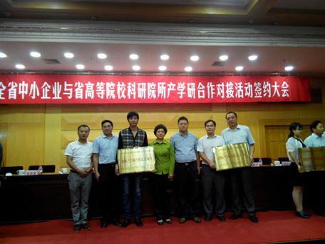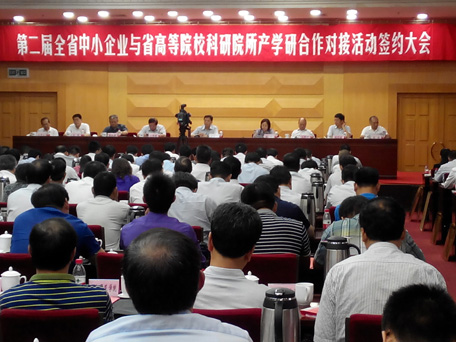 9月28日下午,2015河南省第二届全省中小企业与高等院校科研院所产学研合作对接活动签约大会在省人民大会堂三楼多功能报告厅举行。副省长张维宁、省委组织部副部长省人才办主任安平、省政府副秘书长王登喜、工信委主任王照平、教育厅副厅长訾新建、财政厅副厅长赵庆业、科技厅副厅长宋林、发改委副主任、商务厅副厅长出席了会议;全省各市县政府、省直局委办、工信委等负责人、各高校、科研院所负责人及企业代表近300人参加了大会。大会由安平副部长主持,工信委主任王照平通报了第二届产学研合作对接活动开展情况;省政府王登喜副秘书长宣读了2015年省级产学研合作试点项目名单及2015年省级产学研合作试点项目代表授牌仪式;河南天海电器、河南科技大学、省农科院负责人分别代表企业、高等院校、科研院所发言;省级产学研合作试点项目举行集中签约;副省长张维宁作重要讲话。