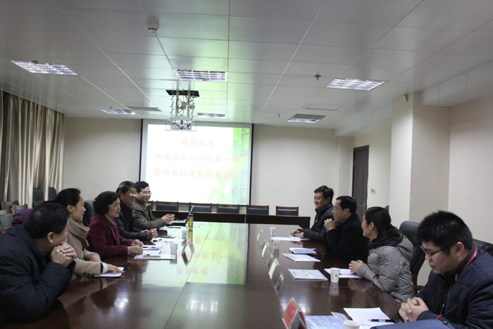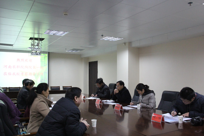 2016年1月6日上午,河南农业职业技术学院副院长陶华、科研外事处处长高素玲、副处长肖杰、付宁一行4人来beat365在线平台官网考察交流。交流座谈会在行政楼617会议室举行,会议由尹新明副校长主持,beat365在线平台官网科技处赵聘处长、史洪中副处长、国际交流与合作部邢淑婕主任、宛磊教授等人参加座谈。