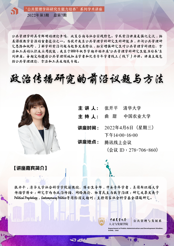 中国农业大学人发学院 学术报告 【“公共管理学科研究生能力培养”系列学术讲座】 2022年第3期(总第7期):“政治传播研究的前沿议题与方法”