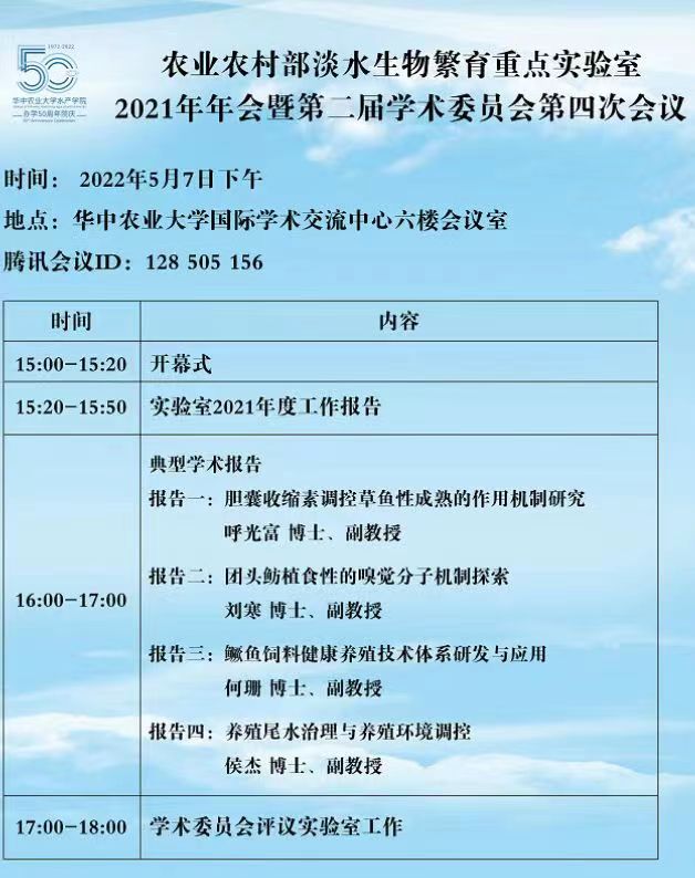 2022年5月7日,农业农村部淡水生物繁育重点实验室在华中农业大学国际学术交流中心六楼会议室举行2021年年会及典型学术报告,水产学院专业技术教师通过线上腾讯会议学习了典型学术报告。