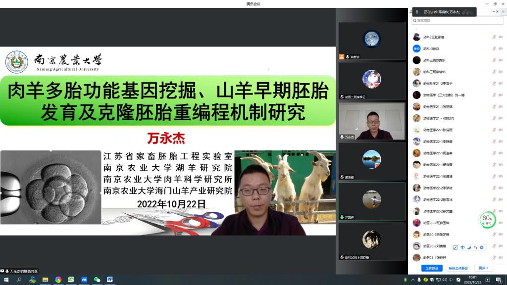 根据动物科技学院科研氛围营造年活动方案,10月22日上午,动物科技学院采取线上方式举办学术报告会。本次特邀请南京农业大学万永杰博士作题目为“肉羊多胎功能基因挖掘、山羊早期胚胎发育及克隆胚胎重编程机制研究”的学术报告。学术报告由动物科技学院科副院长邓凯伟主持,全院师生聆听了本次报告。