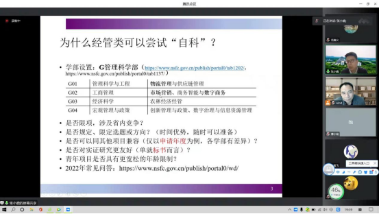 为切实做好2023年度国家基金项目申报培育工作,促进学院科研工作再上新台阶,11月10日晚,工商管理学院特邀清华大学博士后张小鹿作了“国家基金项目申请的经验分享”的线上学术报告。学院全体师生参加了此次报告会,会议由副院长张世军主持。