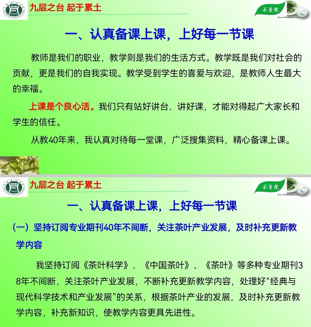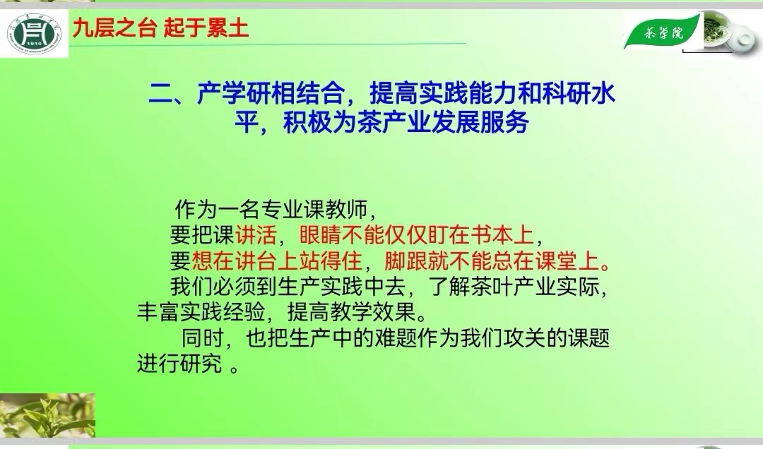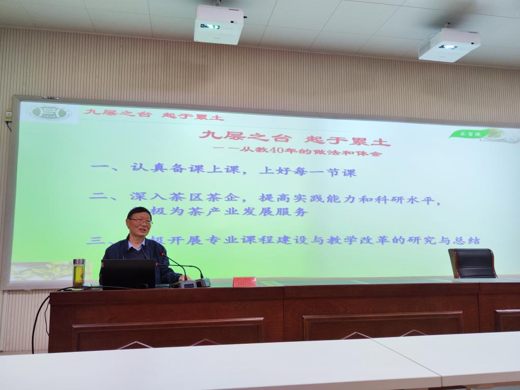 1028日下午,应学校教师发展中心邀请,国家级教学名师、二级教授、茶学院院长、党总支书记郭桂义在学校教师发展中心多功能报告厅为学校2022年新入职教师做一场题为“九层之台 起于累土——从教40年的做法与体会”的专题报告。郭桂义教授用近2个小时的时间,以个人从一个普通教师成为教育部高等学校教学名师奖获得者的成长经历,为新进教师们开启了一场极具魅力的精彩报告。