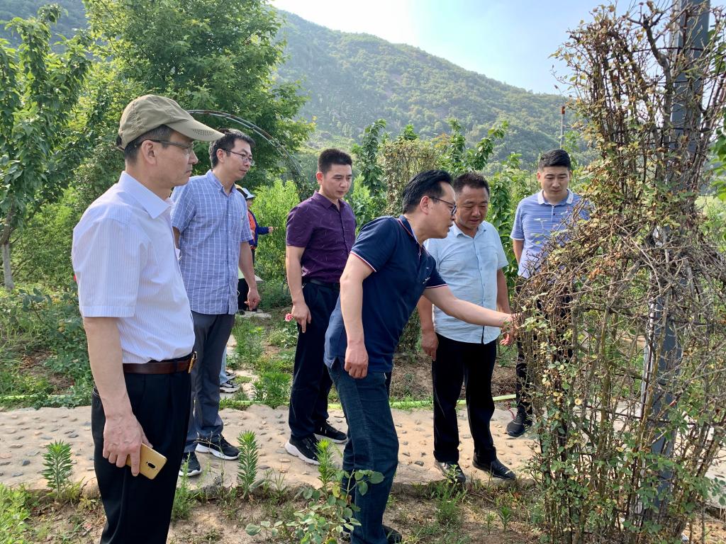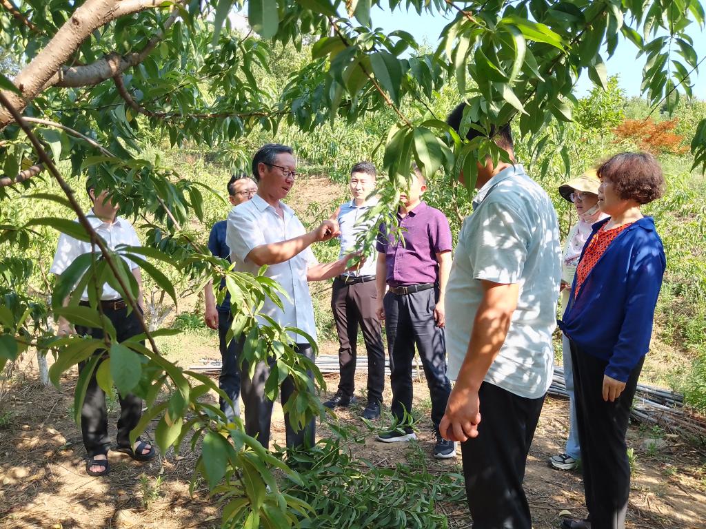 在公司九龙谷月季园基地,服务队首先查看了濒临枯死的造型月季,发现介壳虫和褐斑病危害严重,加上最近天气干旱缺水,大部分叶片脱落。范宏伟教授提出以增强树势为主,病虫害防控加补充营养的综合治理措施。在桃树种植区,范教授现场培训技术人员进行采果后的夏季修剪原则,以通风透光、减少营养消耗为主,对生长过旺的营养枝进行去除,确保中下部花芽的发育和营养积累,并进行了现场演示。