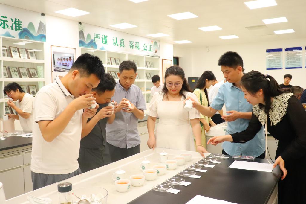 随后,在茶叶感官审评实验室进行了创新工艺红茶的审评实操,科技特派员带领与会人员通过专业的感官审评方法共同探究摇青、冷冻、过滚筒等创新工艺对红茶品质的影响。接着科技特派员针对企业提出的夏秋茶原料较差,茶叶品质难以出彩等问题进行详细指导,苦涩感浓、香气不高扬可以通过适当摊放,水解苦涩滋味儿茶素,散发青气。同时,审评了企业自带的红茶样品,并结合加工工艺,对企业样品进行一一评价和生产指导,让茶企代表真正认识到自己的茶叶和工艺的不足,改善工艺提高信阳红品质。