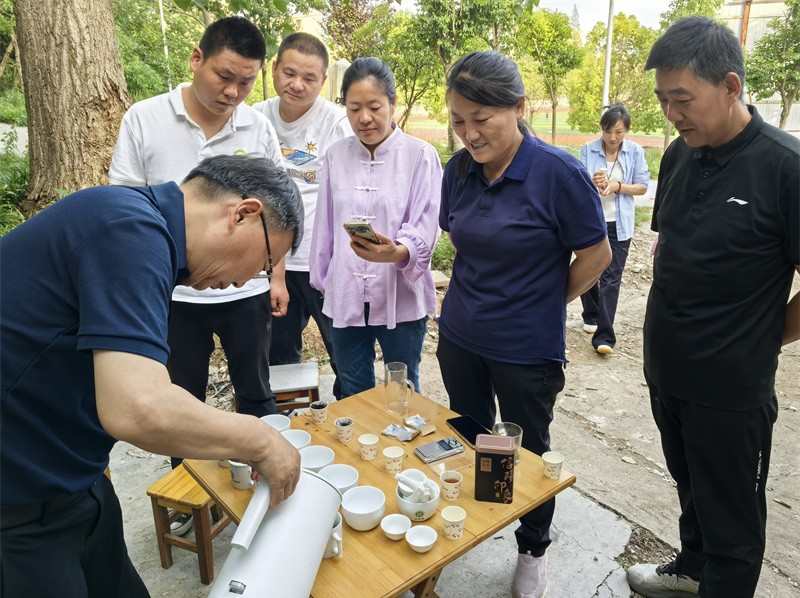 今年6月,浉河区董家河镇集云村村委会小院里,40位茶农齐聚,聆听郭桂义讲授“茶叶技术与品牌营销”。桌上摆着12只白瓷审评杯,他抓起一撮茶叶,手腕轻扬:“这杯汤色发暗,炒条时间太长;那杯香气不足,问题出在烘焙温度偏低。”