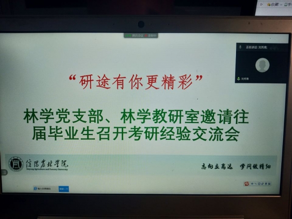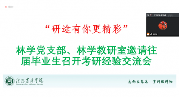 为进一步提高林学专业学生的考研热情,帮助林学院大三学子明确考研目标,掌握相关考研技巧,给有意向考研的学生提供更多考研经验,1218日下午6点,林学院以线上形式举办了“研途有你更精彩”考研经验交流会。本次交流会邀请到了往届毕业生代表海南大学周燕博士、河南大学郑永兴博士、东北林业大学闫平玉硕士。林学院党总支书记赵师成,林学院党总支副书记肖亮,林学院副院长王辉,林学教研室教师及林学专业学生参加了本次交流会,会议由林学教研室主任李文杨主持。