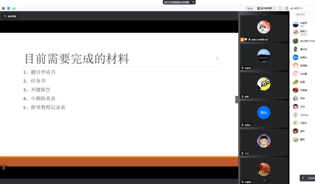 刘秀青首先传达了学校关于毕业论文管理规定,重点指出现在是毕业论文中期检查时间节点,要求指导老师认真做好毕业论文指导工作,整理并检查相关的毕业论文指导材料;其次对于指导老师在检查阶段做好中期检查工作安排,按时完成中期检查工作等;最后各指导教师结合当前毕业论文中期检查工作进行了简要汇报。