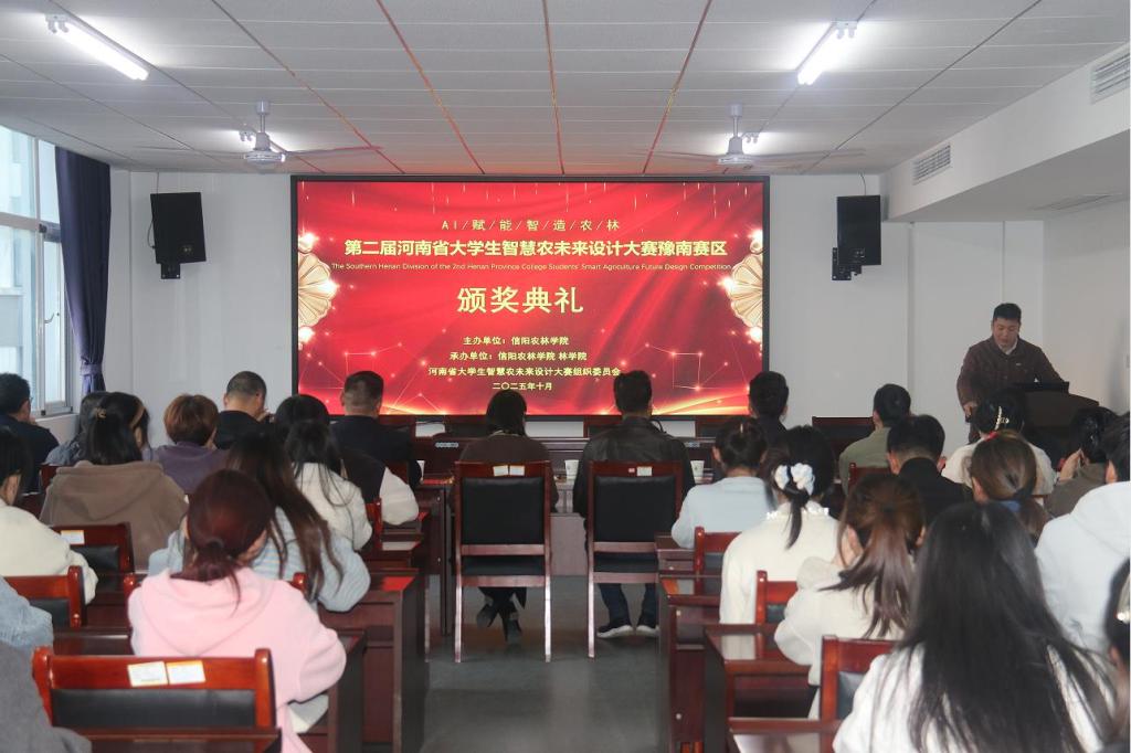 十月的信阳,桂香漫染茶山,稻浪翻涌平原,秋阳正好,藏着豫南最温润的诗意。由beat365在线平台官网举办的第二届河南省智慧农未来设计大赛豫南赛区颁奖典礼,于20251028日在林学院D310会议室举行,出席颁奖典礼的嘉宾有林学院党委书记杜永强、院长王辉、招生就业办公室(创新创业中心)副主任谌昌强、教务处副处长马健、农学院副院长刘合满、林学院党委副书记范阳阳、林学院教学副院长张广波、林学院科研副院长李文杨、林学院学术副院长马天晓,还有各获奖学生代表。颁奖典礼由教学秘书乔良主持。