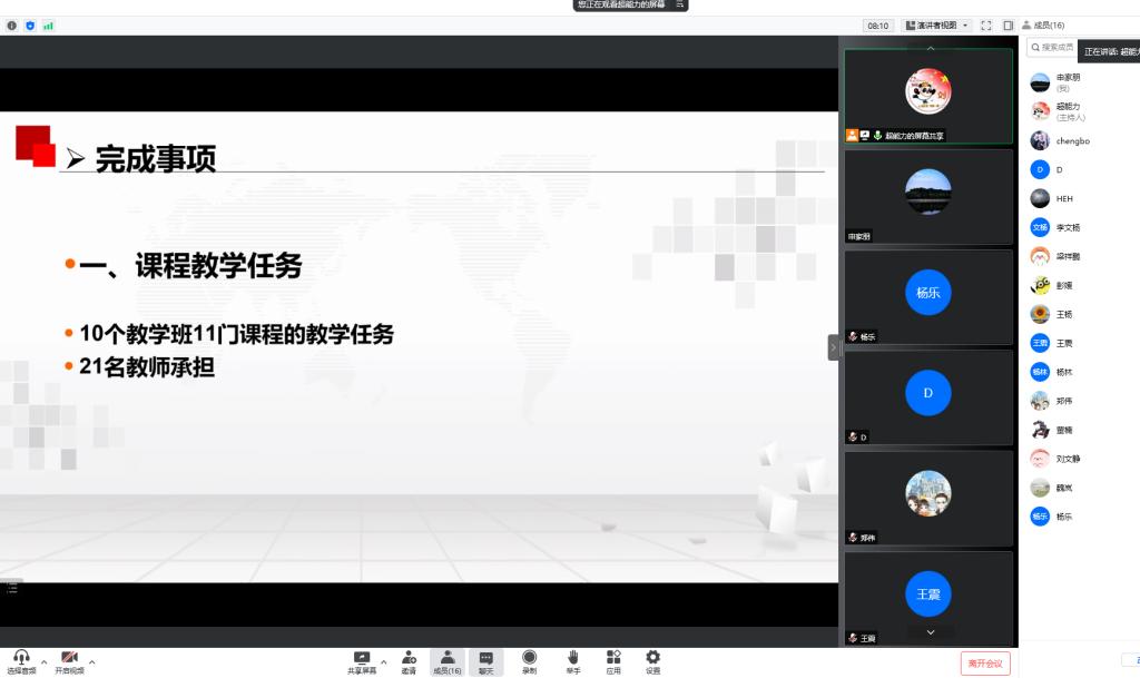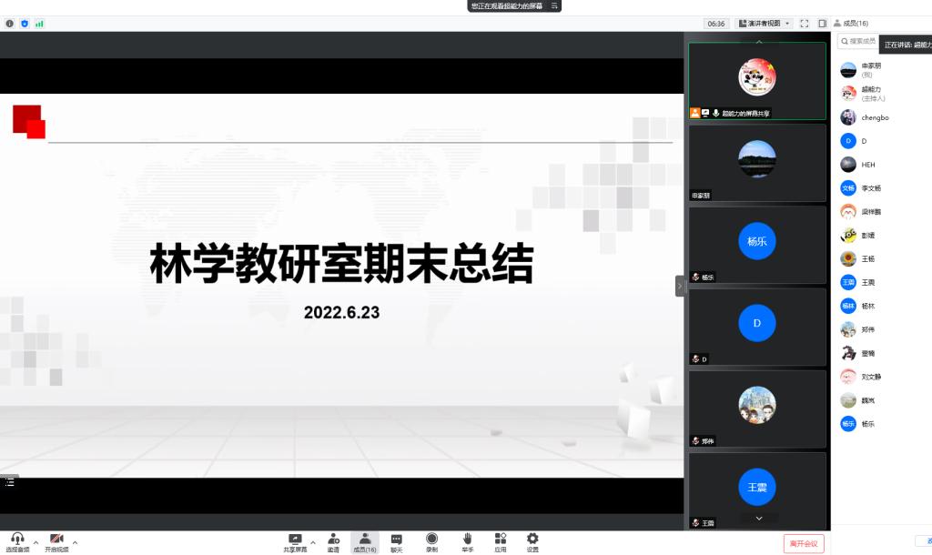 时刻飞逝,充实而快乐的教育教学工作在紧张而忙碌中又度过了一学期。本学期在学校和学院领导的正确领导下,林学教研室全体老师团结协作,积极开展教研活动,认真执行教学任务,深入地开展科研教研等工作,改革并优化了课堂教学过程,提高了课堂教学效率,圆满的完成了本学期的各项工作。2022623日下午在腾讯会议召开了期末工作总结会,会议由林学教研室主任刘秀青老师主持,林学院党总支书记赵师成、林学院副院长李文杨和林学教研室全体教师参加会议。