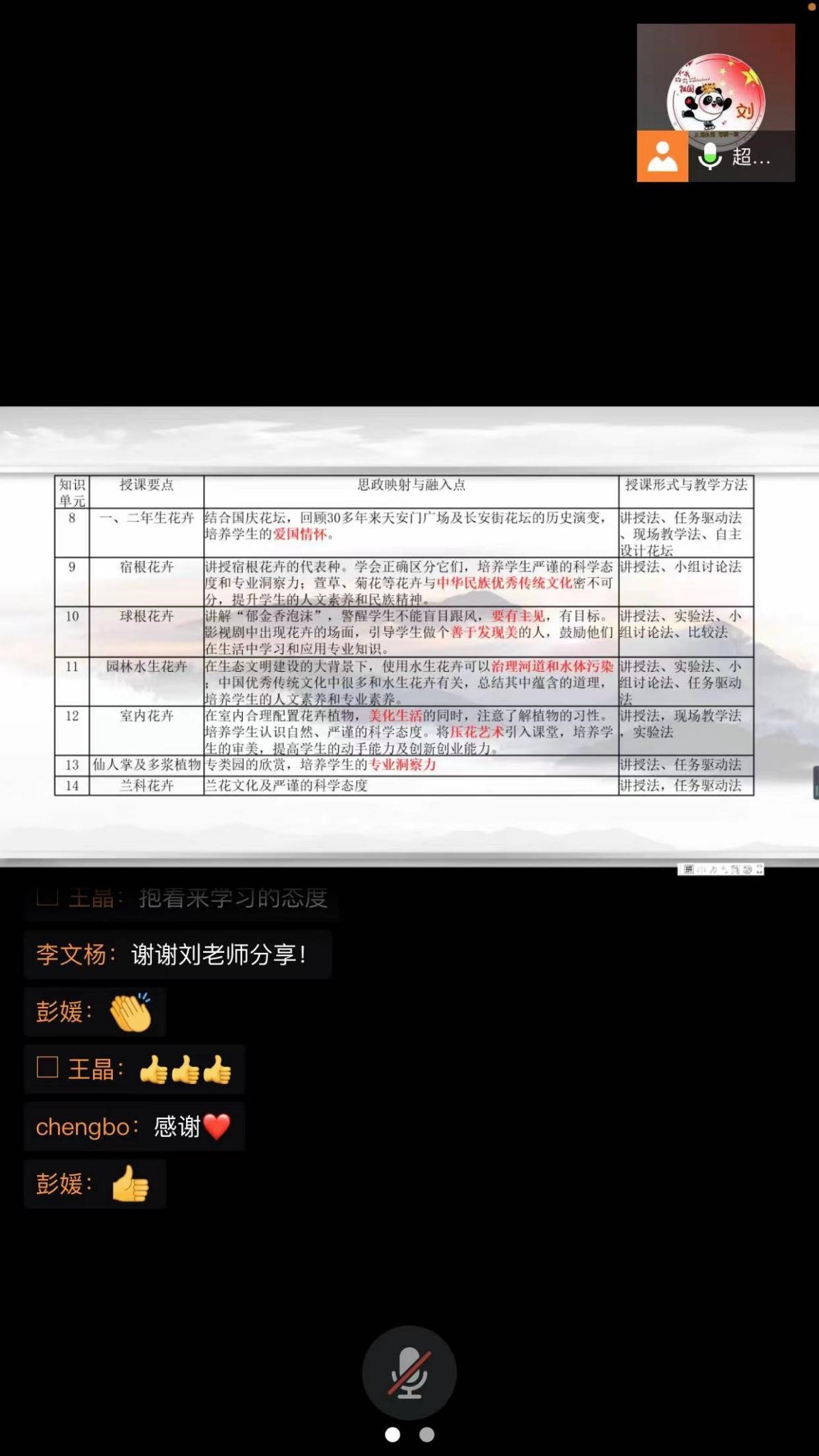 刘老师以园林花卉学课程思政建设项目入手,讲述如何把园林花卉学的专业内容与思政相结合,为大家详细介绍了该课程思政建设的具体教学方法和教学理念及思路,从坚持“专业知识文化与思政课同向同行”的教学理念,明确每个知识点与思政的结合,用工匠精神、三农情怀、家国情怀、名人事迹、中国传统优秀文化、中国传统节日等课程思政融入点,激发学生树立远大理想和抱负,树立为建设美丽中国而努力的决心。坚持融入课程思政,努力做到课程思政建设与专业内容的结合,润物细无声。
