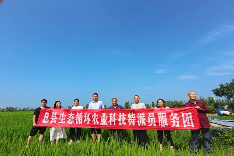 服务队一行首先来到位于息县路口乡弯柳树村的息县远古生态农业科技有限公司,在总经理王春玲的陪同下实地察看酵素水稻生长情况,详细了解近期水稻水分管理及有机栽培的相关资料记录等情况,并对下一步稻田田间管理、农用酵素生产和施用提出指导性意见。