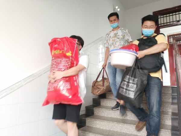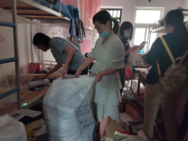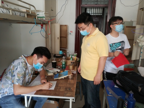 在宿舍区,毕业班辅导员与返校的同学们一起,通过视频连接的方式,帮助未能返校的学子们,仔细清点个人物品,认真收拾打包。