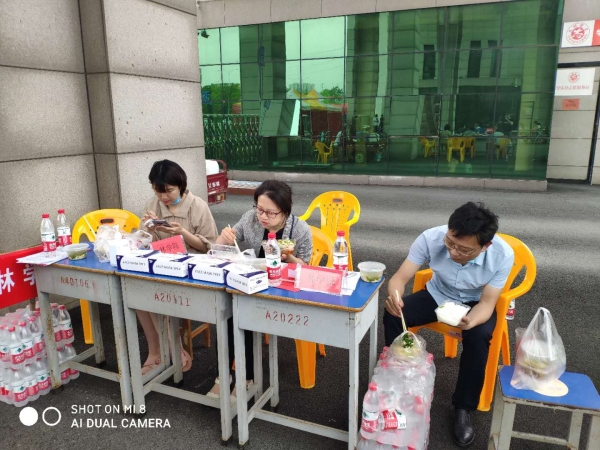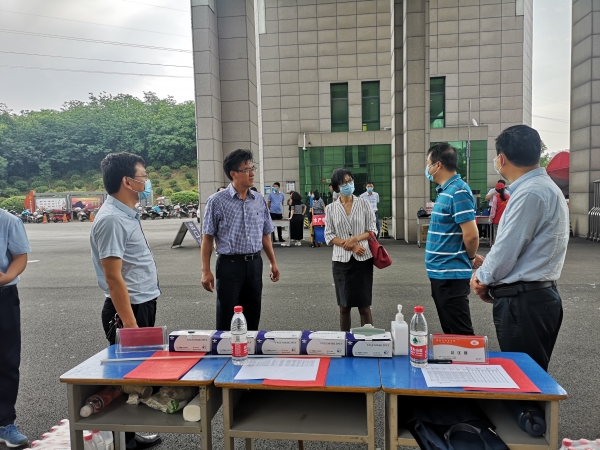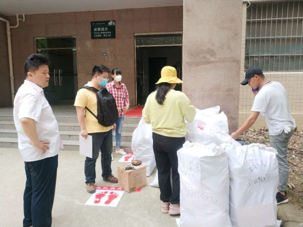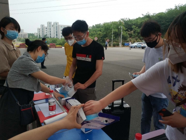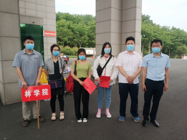 林学院党总支书记赵师成、院长孙耀清和林学院学工组全体人员,24日上午早早来到校门口,悉心准备了矿泉水、口罩、消毒液等物品,热情迎接第一批返校学生的到来。