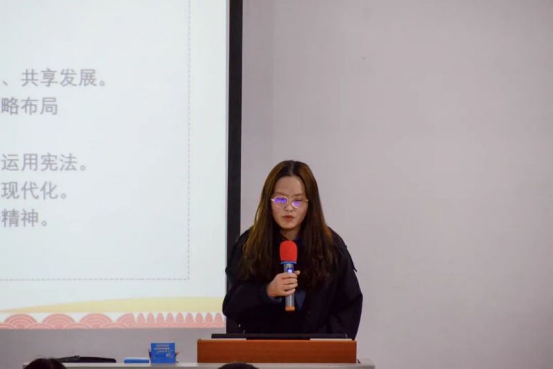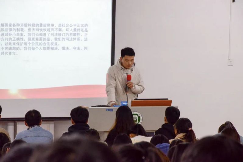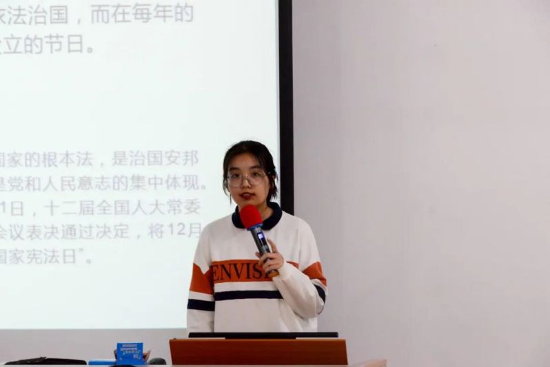主持人开场宣布比赛规则,演讲人通过ppt的形式为同学们介绍国家宪法。比赛过程中演讲人通过自己的见解向同学们分享了宪法有关知识。
