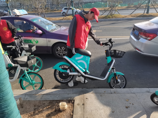 活动开始后,班委对班内人员进行分组,确定小组组长,并明确划分了相应的规整区域。每组成员都尽其所能,工作细致入微,不仅对单车进行规范的摆放,而且对沿途的垃圾进行了细致的清理。同学们也呼吁过往的群众文明骑行,爱护共享单车,将“文明共享,绿色出行”的健康理念传递出去。