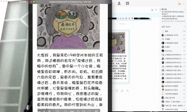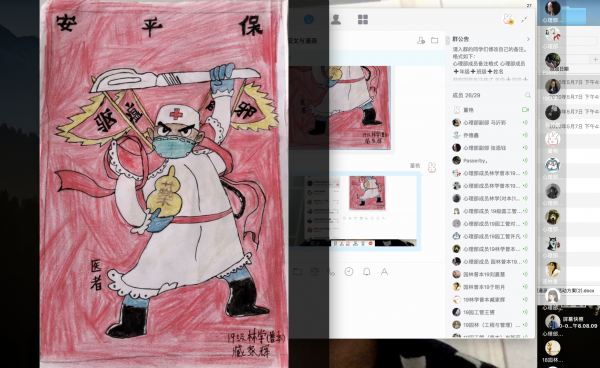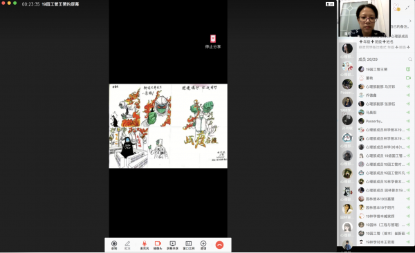 2020525日晚,林学院用QQ视频举办了题为逆境携行 你我同心的线上分享会。本次分享会由林学院董艳老师主持,林学院心理部成员及参加此次漫画、征文的同学参与讨论。部分同学对自己的作品进行了解读,对目前的生活、学习情况及个人感悟进行分享。