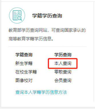 毕业时间在2002年之后的高等教育毕业证书(包括研究生、普通本专科、成人本专科、网络教育、开放教育、高等教育自学考试以及高等教育学历文凭考试等),登录中国高等教育学生信息网,点击“学籍学历查询-本人查询”。