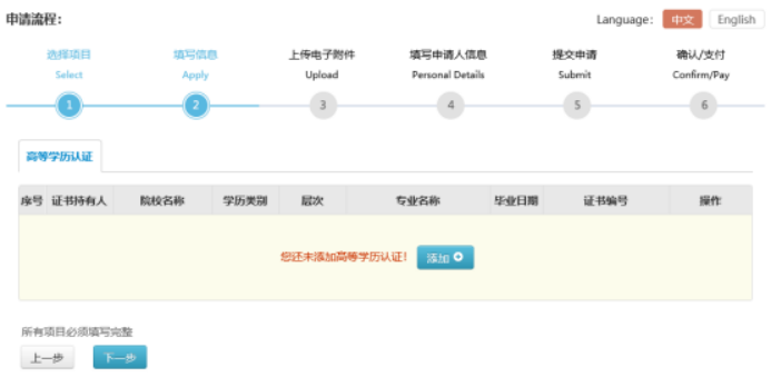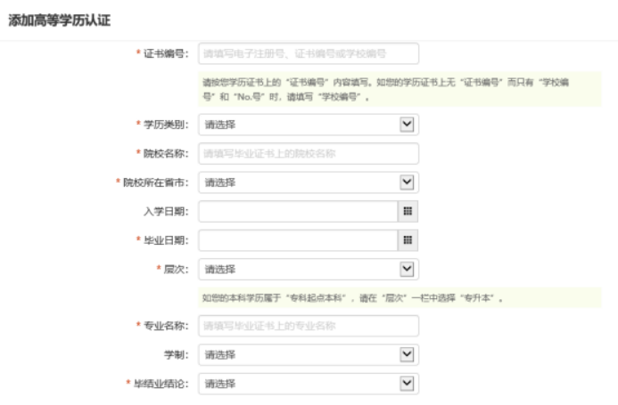 在接下来的页面里,按照申请流程添加学历并按照页面提示要求认真填写个人及毕业证书信息。