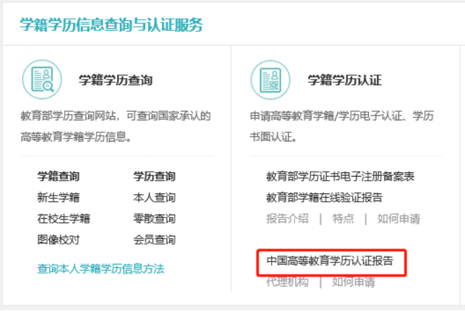 登录中国高等教育学生信息网(http://www.chsi.com.cn/),点击“学籍学历认证-中国高等教育学历认证报告”