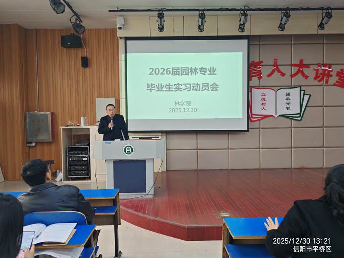 为切实做好2026届毕业生实习工作,明确实习要求,保障实习顺利开展,12月30日中午,林学院在一教E101教室召开园林专业2026届毕业实习动员会。林学院党委副书记范阳阳、副院长张广波、园林教研室主任刘秀青、毕业班辅导员及全体2026届园林专业毕业生参会,会议由刘秀青主持。