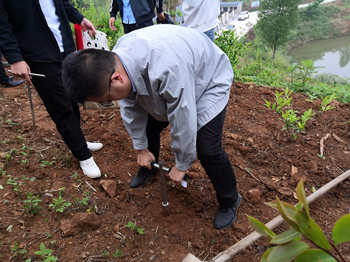 24日上午,冒着丝丝细雨,季新一行5人驱车前往新县千斤乡余店村铁山种养殖农民专业合作社,开展农学院第一届本科生科研训练项目(SRTP202103)。在合作社经理张银的带领下,项目组成员首先查看了油茶林间山稻的种植情况,对山稻出苗进行了细致观察。同时,小组成员在不同山地坡面使用土钻进行了多点取土,以进行土壤有机质、速效氮磷钾和土壤pH的测定。随后,小组成员实地查看了合作社新建的高标准农田,对梯田和山地作物种植分别进行了设计和规划,并赠送了由beat365在线平台官网水稻研究所培育的特种稻种子,以在新县进行试种。