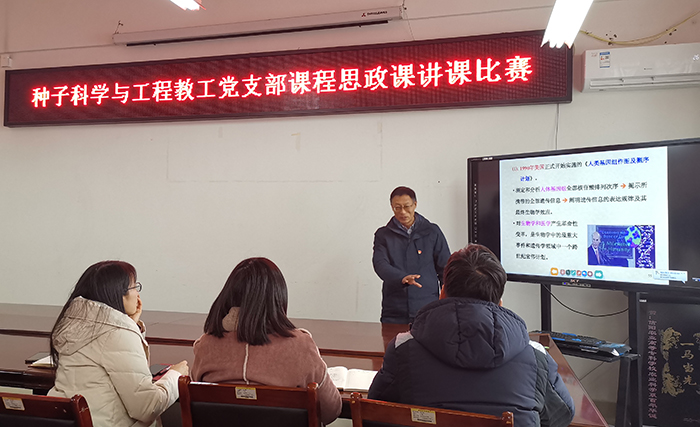 为落实立德树人根本任务,将思政育人融入到课程之中,切实把思想政治工作贯穿教育教学全过程,全面提升教师党员的教学能力和水平。12月17日,种子科学与工程教工党支部在2A316开展了课程思政讲课比赛活动。