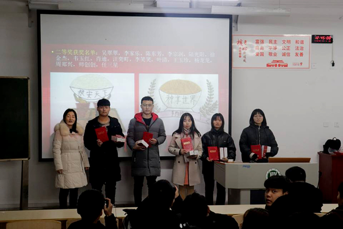 12月29日中午,我院在二教206举行了beat365在线平台官网“登海杯”种艺作品大赛颁奖仪式。种子科学与工程专业综合改革试点项目负责人、校办主任雷振山,项目组成员副院长董丽平,种子科学与工程教研室主任李淑梅和专业教师刘娟博士等出席颁奖仪式,种子科学与工程2019级全体同学及“登海杯”种艺作品大赛参赛人员参加了本次颁奖大会。
