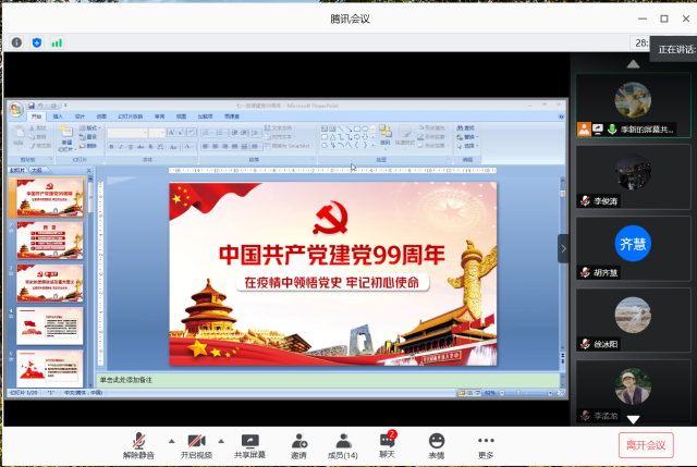 为庆祝建党99周年,深入学习党的创新理论,重温党的光辉历史。7月3日,我院学生第二党支部通过在线会议的形式开展了“牢记初心使命,争当出彩先锋”主题党日活动,活动由支部书记季新主持。