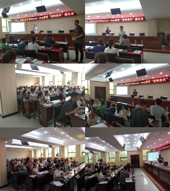 Jung教授和Sampat Ghosh博士分别给广大师生做了《Honeybee Communication》和《Ethnic Food and Nutrition security》学术报告。Jung教授绘声绘色地给同学们讲解了蜜蜂的重要性及其多种通讯方式;Ghosh博后汇报了食物与人类发展的关系,食用昆虫的营养重要性及未来前景。同学们认真聆听,并积极主动询问蜜蜂学和食用昆虫等方面的问题。